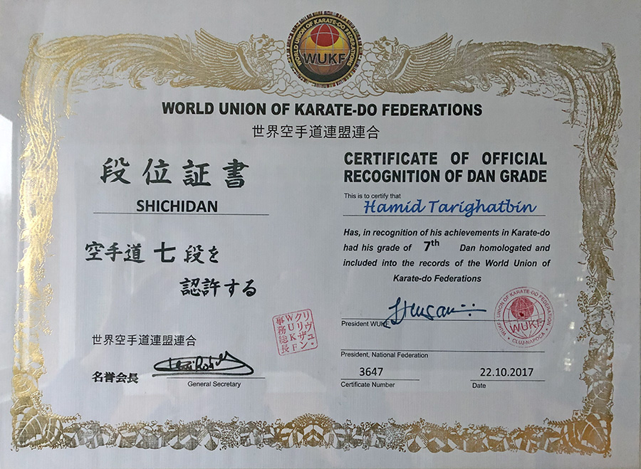 • 7th Dan (degree) black belt from World Union of Karate-Do Federations (WUKF)