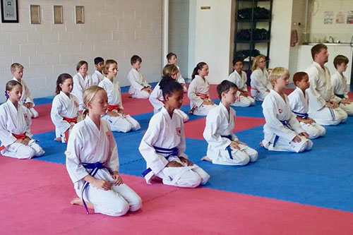 The Dojo Captain, the senior person at the head of the line will call out "Seiza!" as the command to sit. The instructor will move first followed by the senior students down to the junior students until all seated in the correct position. The Dojo Captain will them shout out the Karate-Do, one line at a time, and immediately the entire class will repeat each line back.